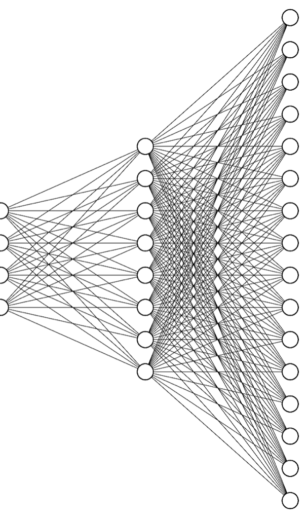 Im Folgenden wird ein Autoencoder vorgestellt, der mit mehreren hundert Bildern von Äpfeln und Bananen trainiert wurde, die 16x16 Pixel groß waren (mit den Farbkanälen rot, grün, blau). Die Zahlenwerte der Pixel der Bilder wurden dabei ganz einfach und simpel allesamt als Eingabe verwendet, weswegen das Netz auch 768 Eingaben hat (16⋅16 Pixel ⋅ 3 Farben). Wie bei Autoencodern üblich sollte das neuronale Netz lernen, für jede Eingabe genau dasselbe Bild als Ausgabe zu liefern. Zu diesem Zweck bestand die Architektur des Netzes insgesamt aus 768+256+16+4+16+256+768 Neuronen (in der folgenden Abbildung nur schematisch angedeutet).